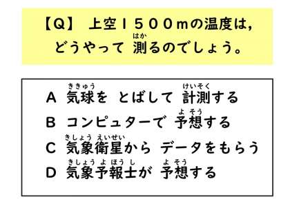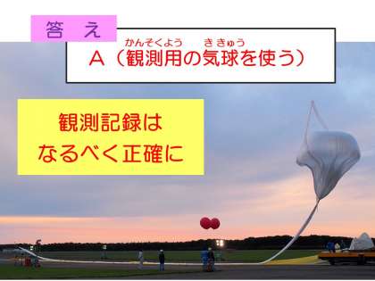 というわけで,答えはA。気温をはかるためだけに,1日に2度も気球をとばしているのです。これは,日本だけでなく全世界のおよそ800か所で行われているというから驚(おどろ)きです。こうした地道(じみち)な活動のおかげで,正確な予報が可能なのですね。