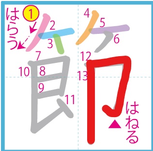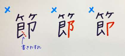 ○「節」…12画目,13画目をまちがえないようにしましょう。まちがいの例を書いておきました。自分の書いたものと見比べてみよう!