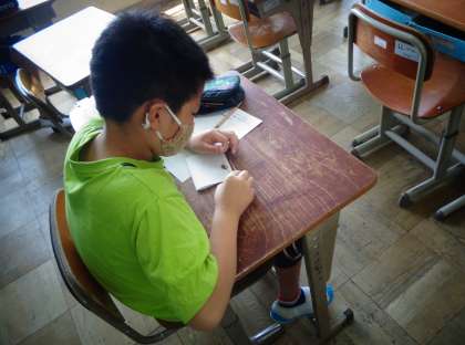 5年生初めての理科は,インゲンマメの観察を行いました。形や色をよくよく観察して,気づいたことや考えたことを文にしてまとめていました。
