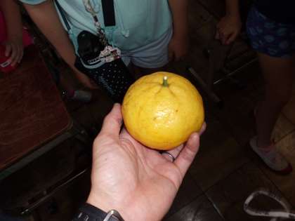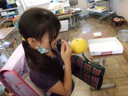 国語科では「白いぼうし」の学習を進めています。物語の中に出てくる夏みかんを理科を担当してくださっている吉村先生が持ってきてくださいました。「匂いなんてしないよ!」という子どもの声。「少し皮に爪を立ててみて!」すると,「とてもいい匂いがする!」と盛り上がっていました。