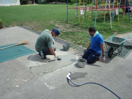 芝生広場に行ってみると,管理用務員と教頭が芝生前のコンクリートのひび割れの修繕をしてくれています。学校にはコンクリートもあるのです。汗をかきながら作業は無事に終了。教頭「あとは足跡さえつかなければ…」 職人技まではいきませんが,がんばってくれています。