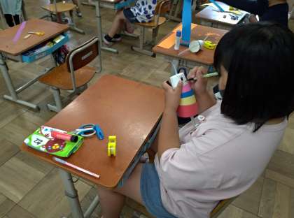 2年生は,今日,図工でストローやかみコップをつかってうごくおもちゃをつくりました。