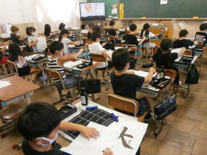 右はらいと左はらいの違いに気をつけて「大」という字を書きました。特に右はらいが難しく,穂先の向きや力の入れ方など,工夫して練習していました。