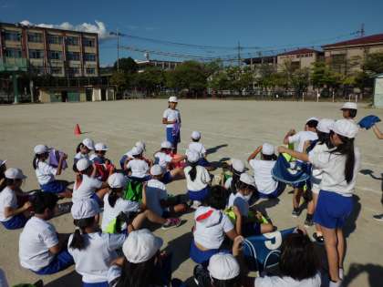 走る順番を工夫したり,バトンのもらい方を工夫したり,子どもたちなりに一生懸命考え,少しでも早く走れるよう頑張っています。授業の終わりにはゼッケンのたたみ方をたたむのが得意な人がレクチャーしてくれました。