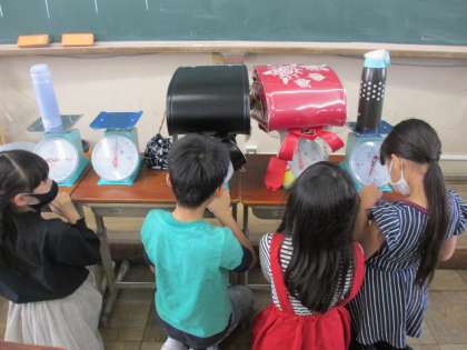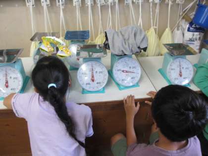 算数の「重さ」の学習の様子です。物の重さを予想し,どのはかりが適切かを考え,選んだはかりを使って重さを量っています。重さを予想するのは,かなり難しかったようですが,子どもたちは楽しんで学習していました。