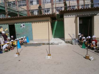 かげは時間が経つと動くのか,また動くとしたらどのように動くのか運動場に出て調べました。