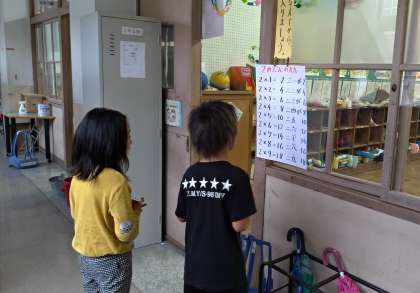 ろうかにはってある九九のひょうをとなえて,しっかりおぼえようとしている子もいますよ!