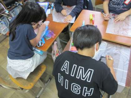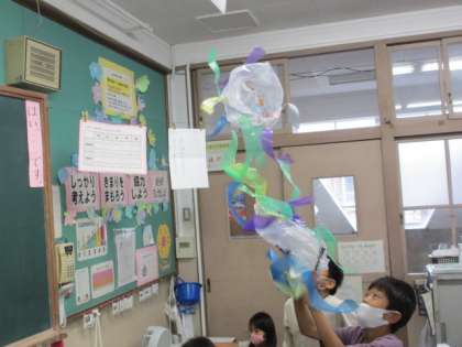ビニール袋に油性マジックで絵を描いたり,すずらんテープを張り付けたりし,送風機を使って飛ばしました。うまく風を捉えると,天井近くまで上げることができ,子どもたちは大喜びでした。