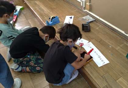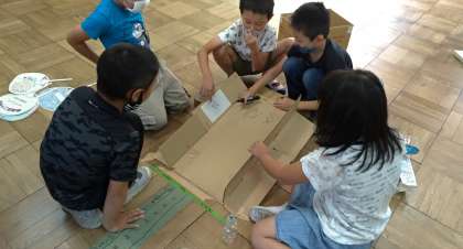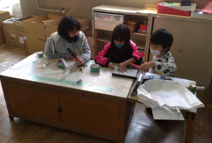 子どもたちは,思い思いにうごくおもちゃづくりにむきあっています。友だちときょう力しながら,さまざまな新しいはっけんをつみかさねています。