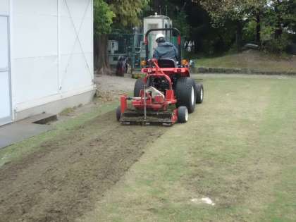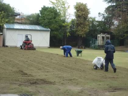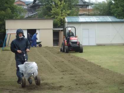 まず,今までの芝生の上を,芝生専用の耕運機が走ります。この耕運機は,芝生の種が土の中におさまるように,カッターのような刃で線を入れて少しだけ掘り起こします。そこに種をまいていくのです。今回,おやじの会の会長さんが種をまいてくださいました。