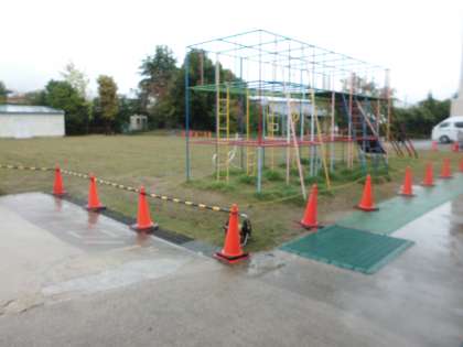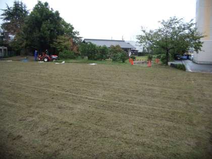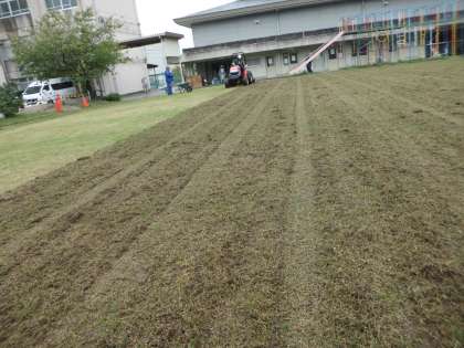 全体をほりおこし,種をまいていきます。そのあと,種が浮かないように,ローラーで固めていきます。今回は雨がふっていたので,ローラーをかけた後,養生シートをかぶせる作業は後日となりました。しばし,芝生広場は使えませんが,11月になれば,また元気に走りまわれますよ。
