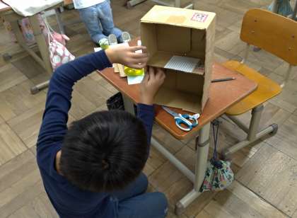 どんぐりや貝,ペットボトルのキャップなどで『小さな友だち』をつくって,その小さな友だちが楽しくあそべるような小さなおうちをつくりました。