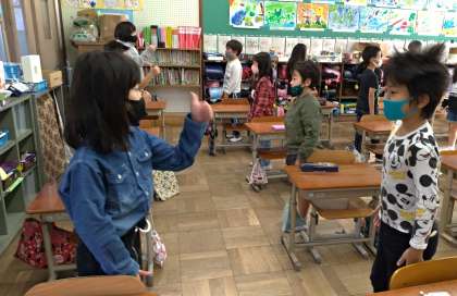 友だちと話し合いながら,出てきたどうぶつをえい語で言ってじゅん番をかくにんしました。