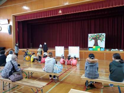 劇では人権を意識し,目標を「なかよく」しようにしました。今年は1年生の2人と,