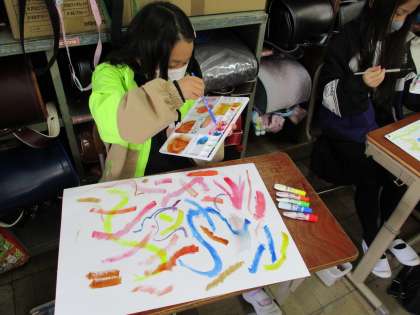 絵具を使って,おもいおもいに表現しました。水の量を調節したり,筆の使い方を工夫したり,色を混ぜてつくったりして楽しみました。イイ感じです。