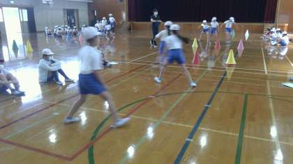 反復横跳びは今日が初めて。3本の線の越え方を確認しながら丁寧に取り組みました。
