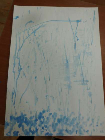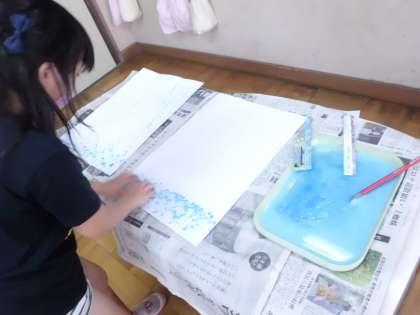 図画工作の時間に,画用紙に絵具を使って雨を表現しました。小雨の子もいれば両手を使い,大雨を降らしている子もいました。どんな作品になるのかな。完成が楽しみです。