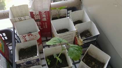 1人1粒たねまきをしたツルレイシが芽を出しました。3クラス合わせて4つと少ないですが,学校園に植えかえるには十分。