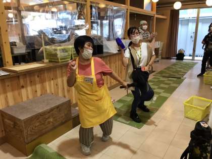 リズムにあわせてノリノリで生地をこねました。みんなも先生もうどん学校の先生も。