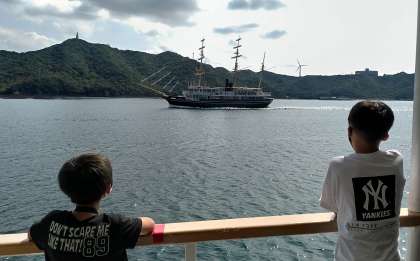 向こうの方からもうひとつのクルーズ船がやってきました。子どもたちは手をいっぱいふっていました。