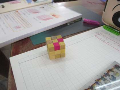1立方センチメートルキューブを積み上げて課題の立体を作ることで,体積の概念を獲得します。キューブが小さいので積み上げるのに少し手こずっていた子ども達でした。