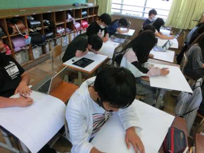 図工の時間に,学校内のお気に入りの風景を写真で撮り,絵に表していく学習を進めています。