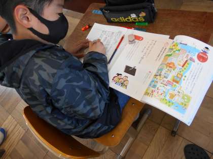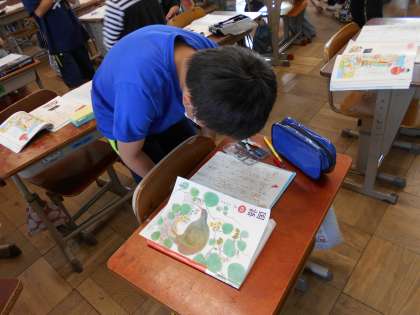 イラストから町の様子をしょうかいしました。みんなのしょうかいした文章を見ています。