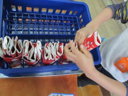 給食の時間は,静かに一口一口味わっていただいています。おかわりしたい人の手が元気よく上がります。はじめは,うまくできにくかった牛乳パックの片付けも少しずつ自分たちでできるようになってきました。
