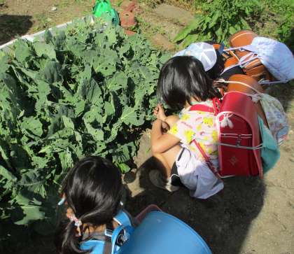 理科の時間に,モンシロチョウの卵について学習しました。放課後,早速キャベツ畑に卵を探しに行っている人がいました。これから卵から育っていく様子を観察していきます。