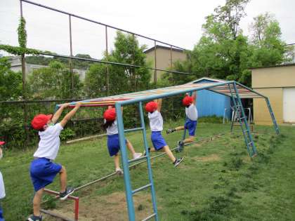 体育「ゆうぐであそぼう」では,安全に気を付けて運動できるよう棒の握り方にも気を付けています。(ひっかけて持つのではなく,親指を下にしてしっかり握る。)けがをしないように気をつけながら,存分に「ゆうぐあそび」を楽しんでほしいと思います。