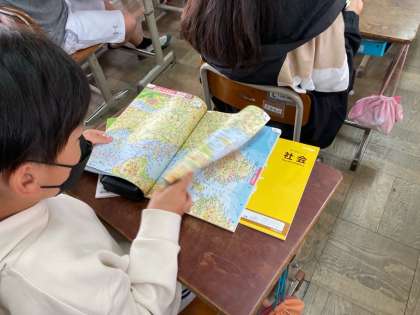 地図帳を使ってグループ対抗のゲームをしながら学習に入りました。
