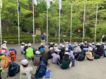 所員さんが施設や生き物などについて話すのを一生懸命に聞いている子どもたちです。