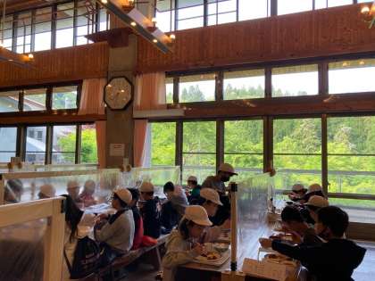 慣れない場所での宿泊に,寝不足の表情が多く見られます。昨日ほどモリモリ食べている児童は少ないですが,晴天を眺めながらの朝食です。