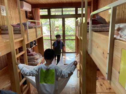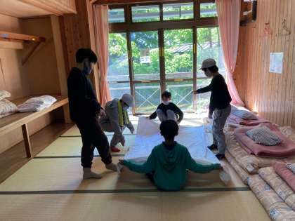 シーツたたみに大苦戦の子ども達。ここで「協力」です。