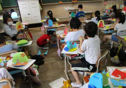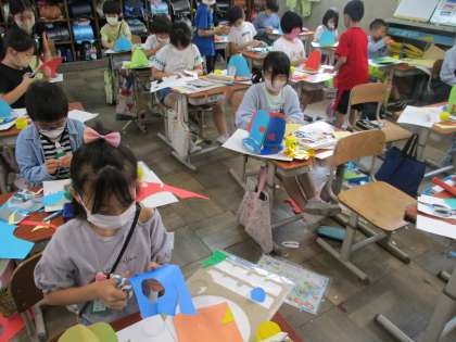 くるくるランドの3回目です。くるくる回る土台ができ,上の飾りをつくり始めました。みんな集中して作っています。