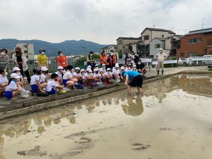 5年生では社会科の稲作の学習と関連づけて,実際に田植えをします。