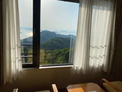 宿泊する休暇村に到着しました!部屋からの景色もきれいです。これからうどん打ち体験です。