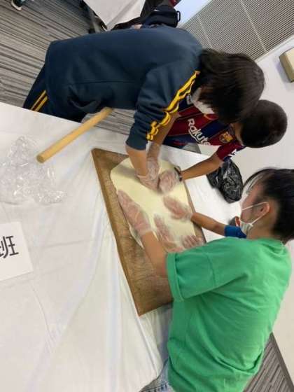 あんなに丸く小さかった生地がみんなの協力で四角くのびてきました!