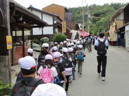 参道のお土産屋さんにみんな興味津々です。