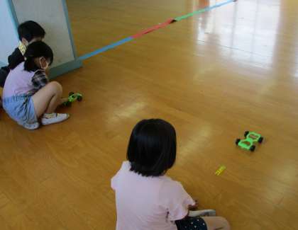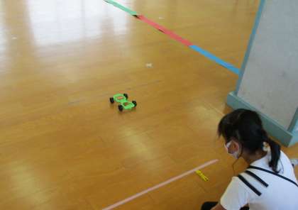 車を組み立て,発射台を使ってゴムの力を使って車を走らせました。子どもたちは,ゴールの場所に止まるように引っ張る強さを調節して車を走らせていました。
