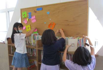 1組の飾り係さんが学年の本棚の周りの飾りつけを,2組の図書係さんが本の整理を休み時間にしてくれていました。