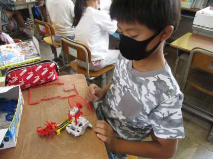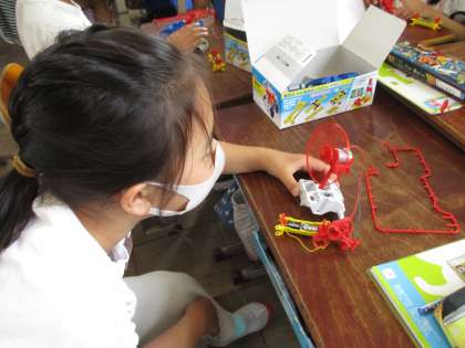 モーターを使って送風機を動かし,人によって回り方が違う理由を考えました。送風機が動いた瞬間はみんな夢中で涼んでました!