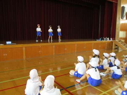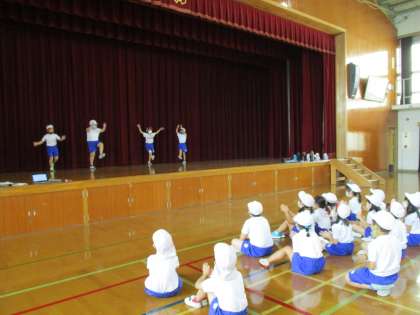 今日は体育の授業中に練習してきた、リズムあそびの発表会でした。