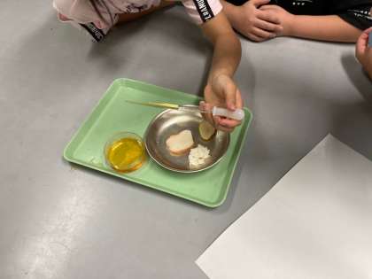 パン,ご飯,ジャガイモなどの炭水化物。また,製造過程でデンプンが添加されているコピー用紙などに,ヨウ素液をかけて反応を見ました。