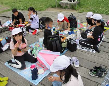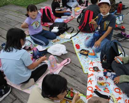 楽しみにしていたお弁当の時間です。班の友達と一緒に大文字山が見える鴨川の河川敷でお弁当を食べました。