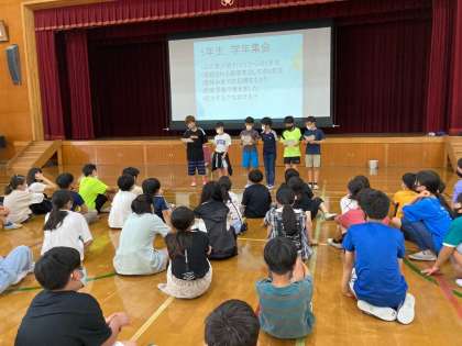 夏休みまであと1ヶ月。5年生が大きく活躍する行事が無いことや蒸し暑さのせいか,中弛みを感じている今日この頃。学校生活の目標を再認識すべく,学年集会を行いました。