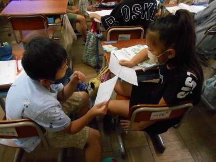 1・2場面と3場面のちがいを【コスモス・食べ物・ゆみこの行動】をキーワードにして話し合いました。