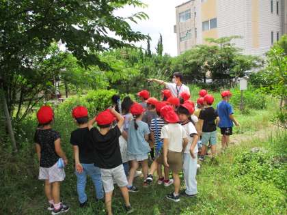 学校の畑やビオトープ,芝生広場…教室を出て,夏を探しに行きました。「バッタがいたよ。」「マリーゴールドが咲いている。」と子どもたちは自然に目を向け,夏を感じ取りました。