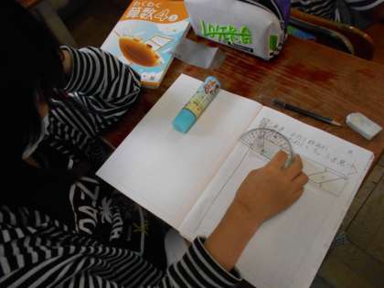 コンパスや分度器を使って,調べています。