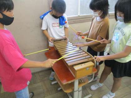 いろいろな楽器を鳴らしたり,ゴムをはじいたり,タコ糸をこすったりして音を出し,気付いたことを話し合いました。